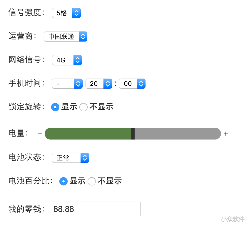 因为对话生成器会提供非常细节的设置选项,上图中几乎所有内容都可以自定义,如信号强度、运营商、网络信号、手机时间、锁定旋转、电量、电池状态…
