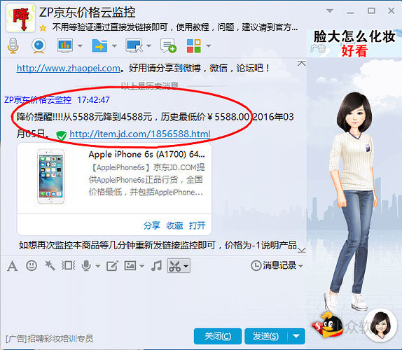 之后就可以挂着 QQ 等待了,如果有降价,就会发消息给你,和上图一样,能够看到降价提示和历史低价,帮助你决策是否去购买。