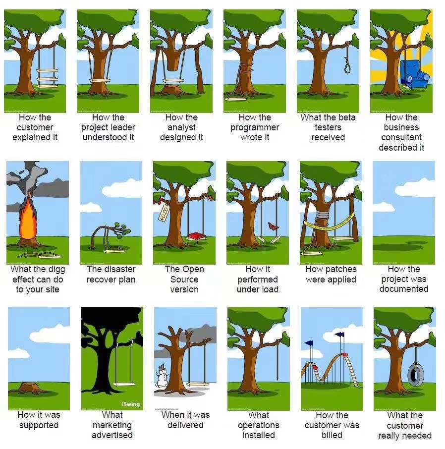 这幅图把软件开发过程中的所有环节都吐槽了一遍,太好笑了